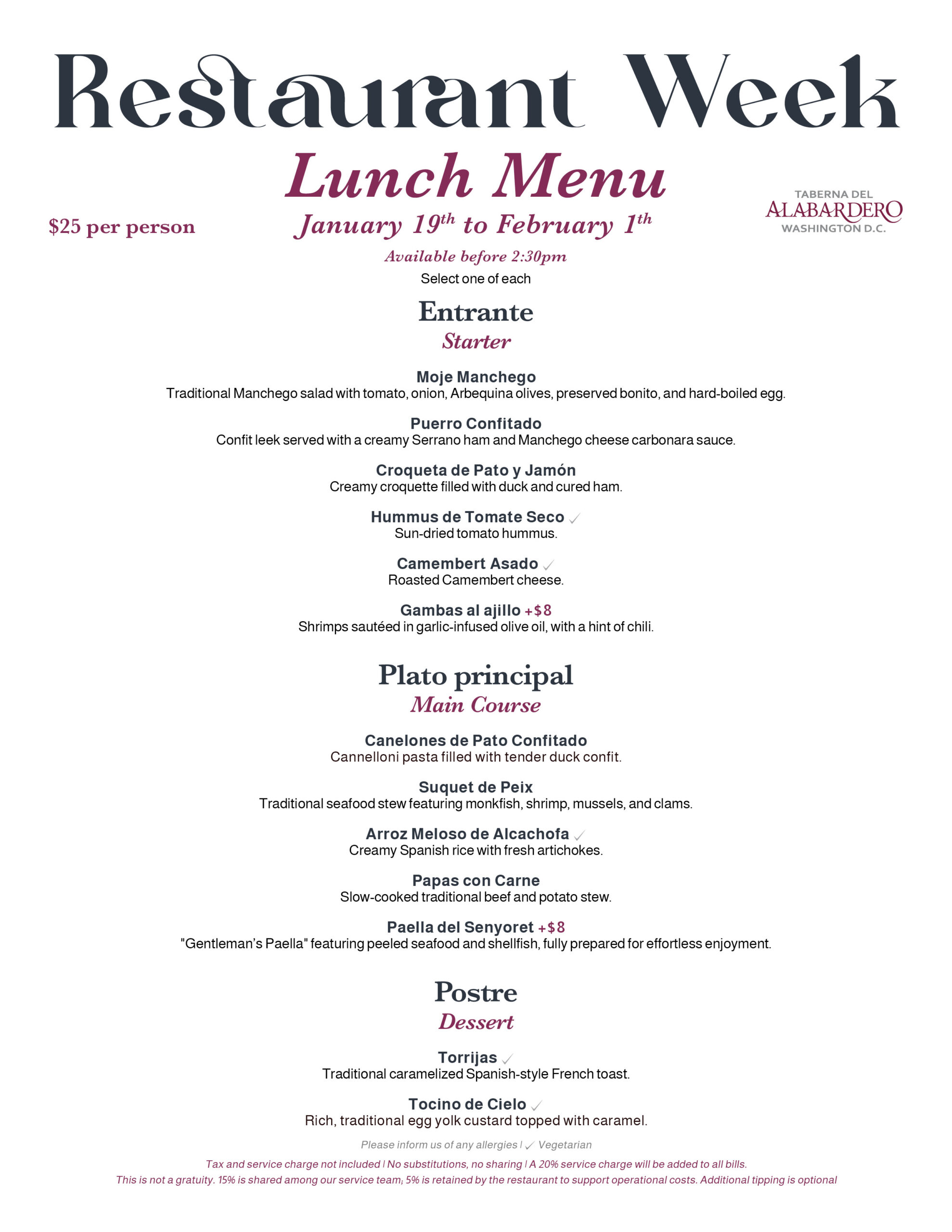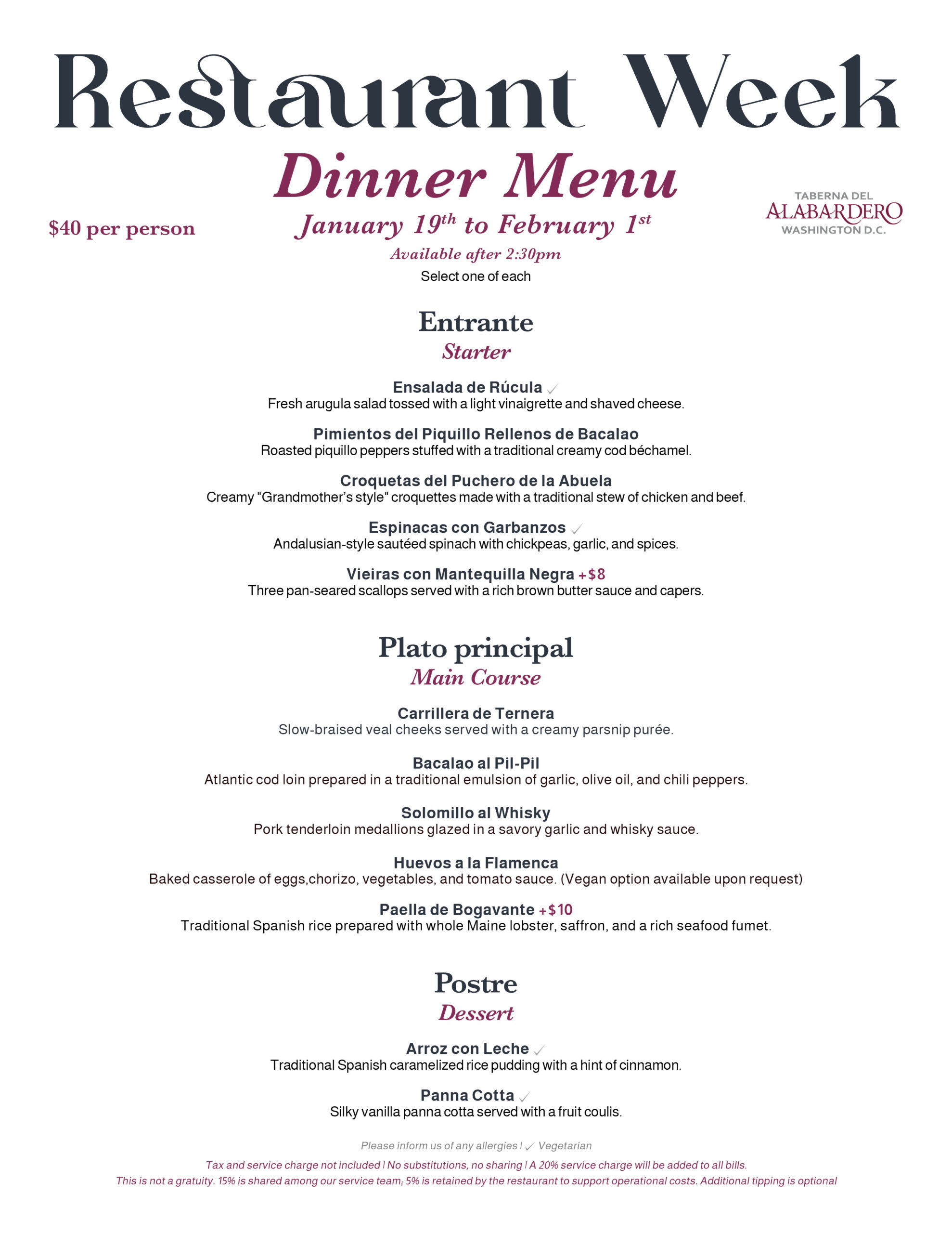 From our traditional croquetas to slow-braised delicacies, we invite you to savor the essence of Spain in the heart of D.C. Enhance your experience with exclusive menu upgrades, including our signature Lobster Paella and Pan-seared Scallops, available for a small supplement.